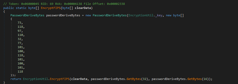 Also of note is the salt value, which is “Ivan Medvedev” commonly found in malicious and non-malicious encryption/decryption salt functions. This salt function can be seen either as ASCII, or converted to bytes, including here: https://stackoverflow.com/questions/10168240/encrypting-decrypting-a-string-in-c-sharp/27484425#27484425