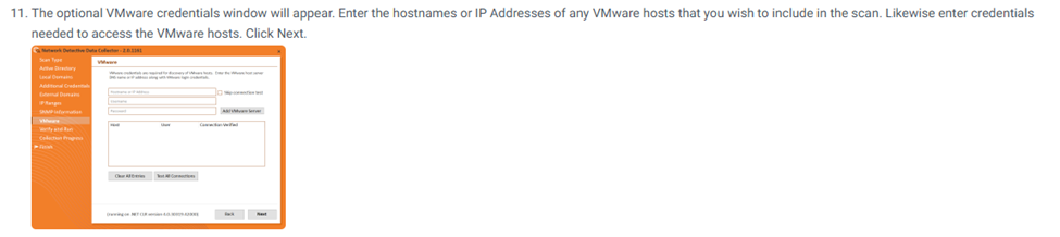 During its normal operation, Network Detective saves usernames and passwords in plain, readable text across several temporary files. These files are stored locally on the device and are not protected or hidden. In many cases, the credentials collected include privileged or administrative accounts, such as those used for VMware.